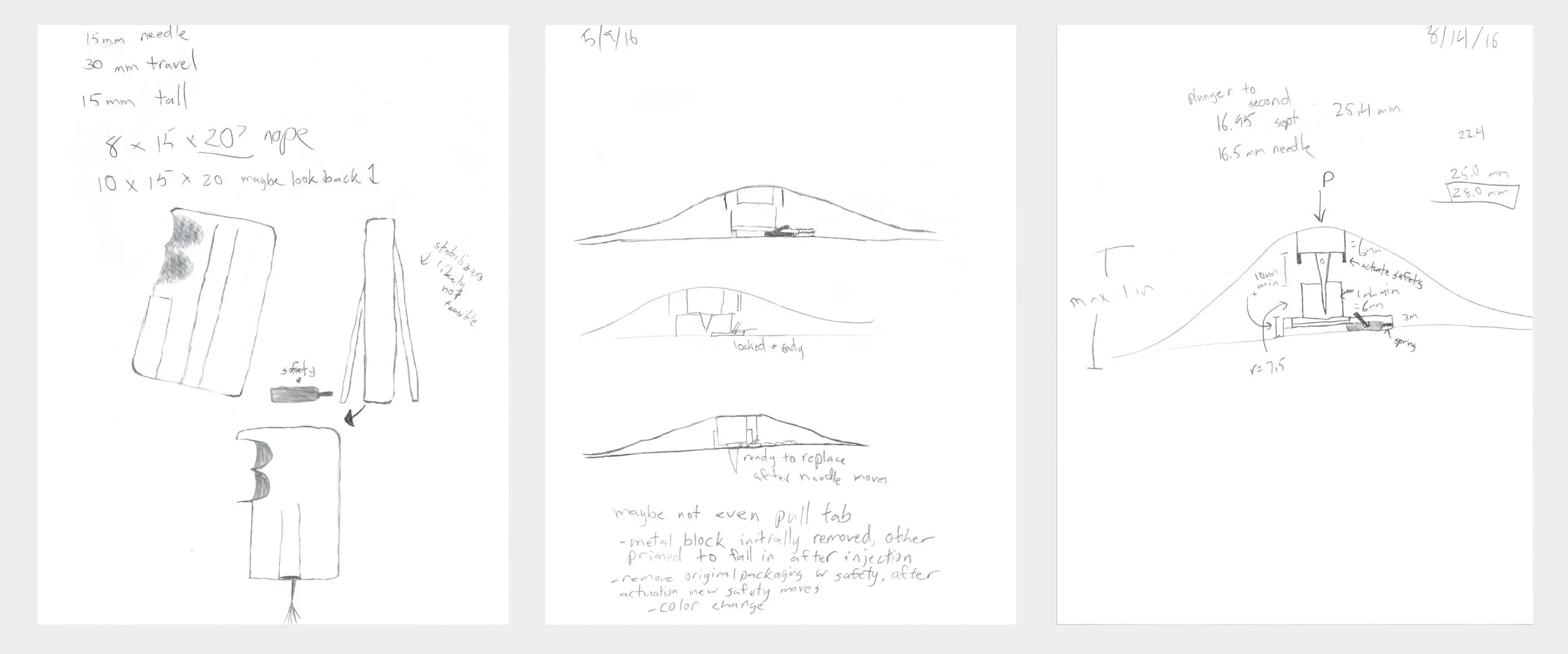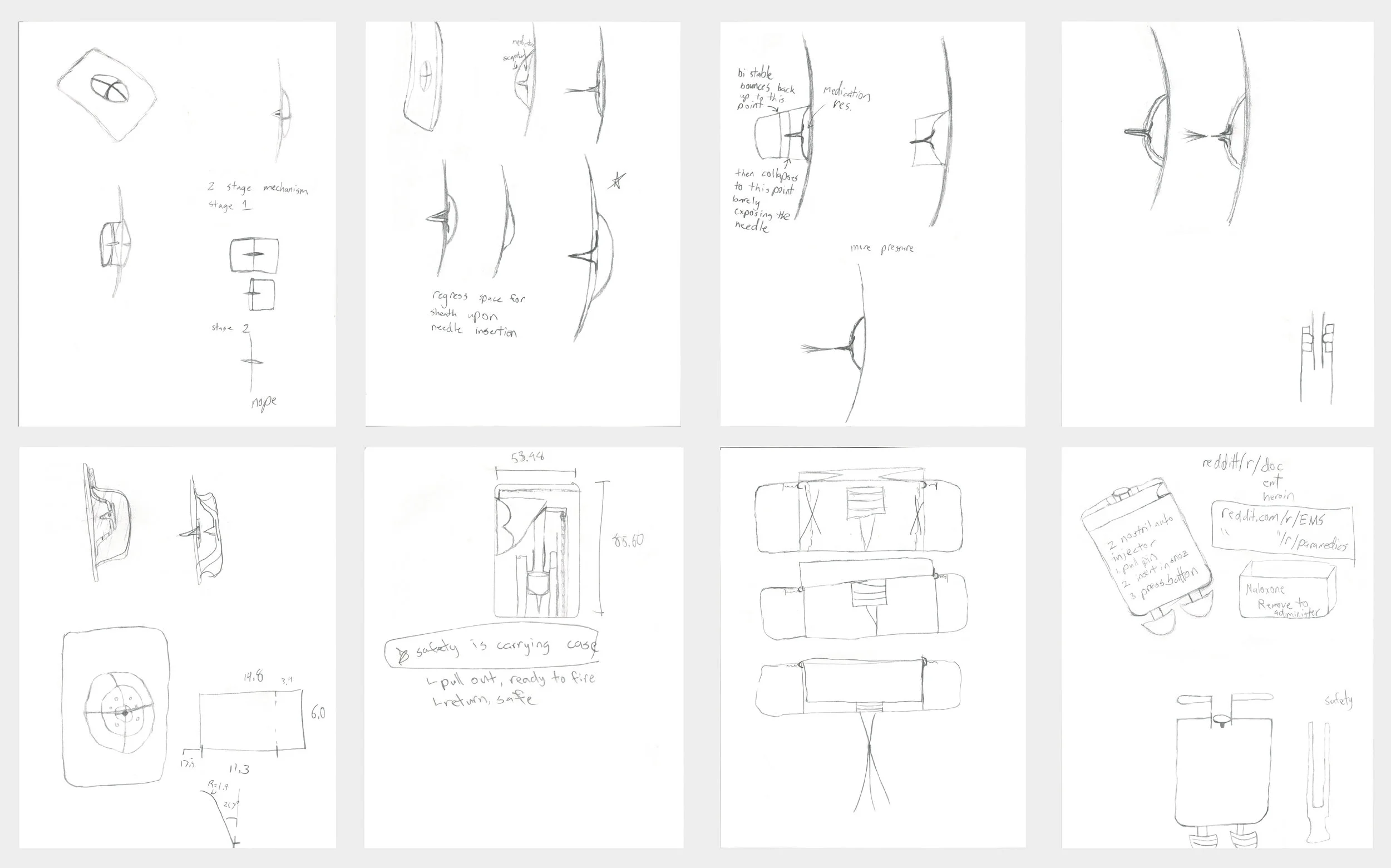 I considered a credit card sized option using wedges to drive the needle and plunger, a two nostril intranasal option, and a number of variations on a patch design. User feedback, size and volume constraints, and intramuscular preference kept the patch as the preference.