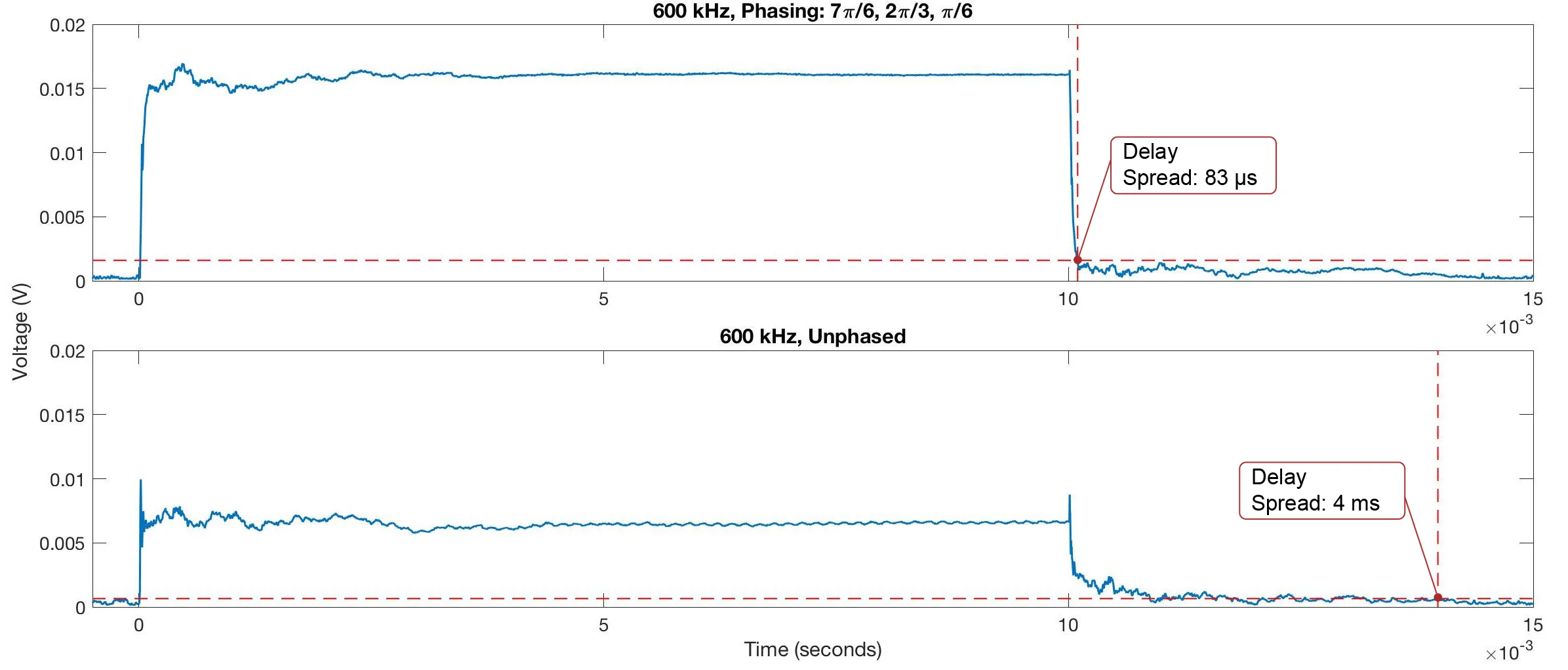 The best candidates were then prototyped on a test channel. We used 2mm piezos, as they produced the most concise beams, steered at the greatest angle, with reasonable pressure magnitude. As can be seen in the experimental results, the 90% die-off from the RMS transmit voltage was reduced by 48 times, or nearly one and a half orders of magnitude.